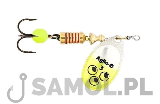 Błystka Mepps Aglia to królowa błystek obrotowych, która została sprawdzona przez miliony wędkarzy. Nowa Aglia -e została stworzona na bazie zwykłej Aglii, którą pokryto specjalną powłoką czułą na promieniowanie UV. Kotwiczka została uzbrojona w duży „ikrowy” koralik, który także odbija pod wodą promienie UV i przez to staje się przysłowiowym „celownikiem” dla żerujących drapieżników.