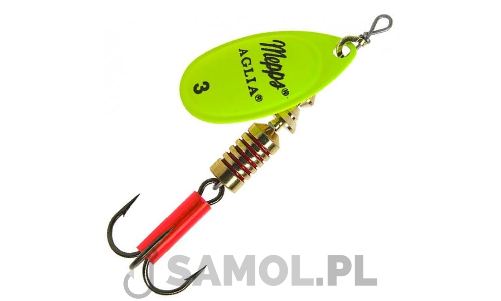 Błystka Mepps Aglia w wersji fluo jest niezwykle skuteczna podczas pochmurnej pogody, głębokich oraz brudnych wodach. W promieniowaniach UV staje się bardziej widoczna.