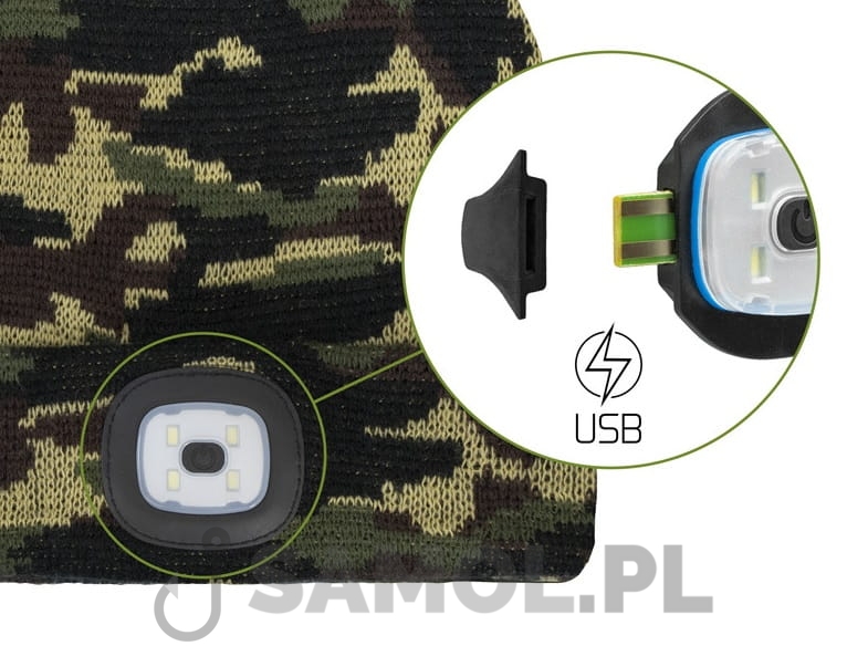 Wyjątkowa czapka zimowa, która zapewni Ci ciepło i oświetli drogę, kiedy tylko będziesz tego potrzebować. Wygodny akrylowy materiał w kamuflażu ochroni Cię przed chłodem jesienią i zimą. Na czole znajduje się bardzo przydatny element - odczepiana lampka LED. Dzięki tej czapce nie musisz mieć stale pod ręką swojej czołówki. Wystarczy włączyć światło na czapce czarnym przyciskiem na środku.