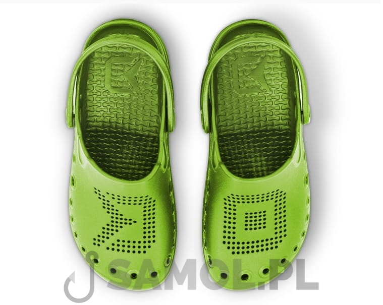 Kolejnymi wyszukanymi elementami są duże boczne otwory, których rolą jest zadbanie o wentylację i ogólną przewiewność tych butów. Nie są one celowo zaprojektowane na niskim poziomie, jak to jest w standardzie, ale nieco wyżej. To właśnie ten szczegół odgrywa ważną rolę podczas pobytu na brzegu lub w płytkiej wodzie. Dzięki temu, że otwory znajdują się nieco wyżej nad wkładką, niepożądane nagromadzenie piasku lub kamieni między podeszwą a stopą jest prawie wyeliminowane. Dzięki temu Twoje stopy są jak najlepiej chronione. Oprócz tych otworów wentylacją jest gruba perforacja znajdująca się w górnej części. Jest celowo ukształtowana z jednej strony w symbol D z logo Delphin, a z drugiej symbol O jako początkowa litera nazwy OCTO. Całkowite wrażenie dodatkowo potęguje delikatna struktura powierzchni podeszwy, która przywodzi na myśl skórę kałamarnicy. Dzięki zastosowanemu materiałowi EVA są niezwykle lekkie, wytrzymałe, a nawet unoszą się na wodzie. Oczywiście ten model posiada pętlę do mocowania pięty (popularnie nazywaną zapięciem), co docenisz zwłaszcza w nierównym lub pochyłym terenie.