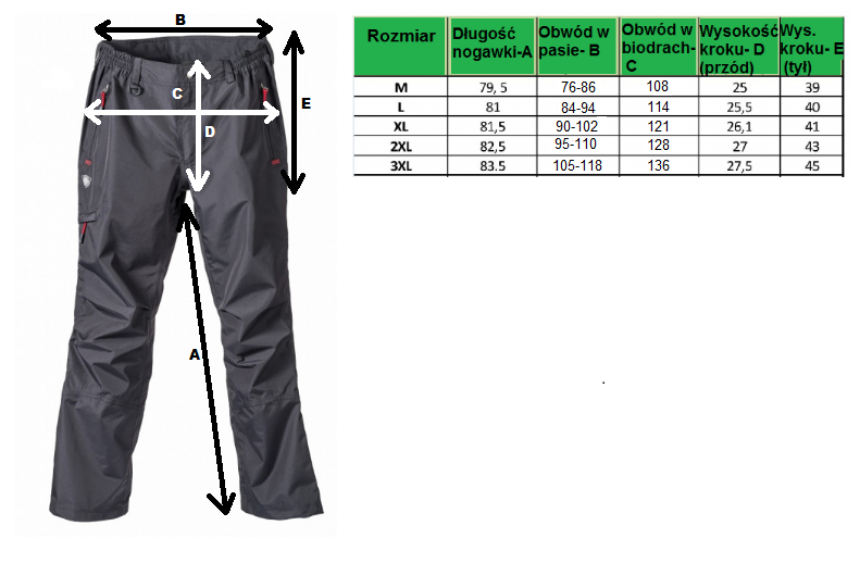Kurtka posiada odpinany kaptur, dwie zewnętrzne kieszenie zapinane na zamek, wewnętrzną kieszeń na telefon komórkowy, elastyczny ściągacz w pasie oraz wysokiej jakości paski na rzepy na rękawach. Spodnie mają trzy kieszenie z przodu i jedną z tyłu, wszystkie zapinane na zamki błyskawiczne. Nogawki posiadają zamki oraz regulowane rzepy. Elastyczny pas z niezawodnym zapięciem pomaga dopasować odpowiedni rozmiar i sprawia, że noszenie spodni jest naprawdę komfortowe.