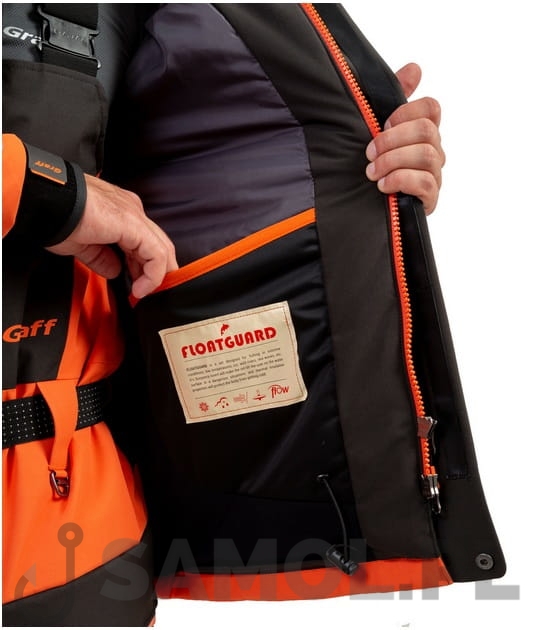 FLOAT GUARD to specjalnie zaprojektowany komplet wypornościowy, który został wypełniony multiwarstwową pianką poliuretanową. Jest przeznaczony dla ludzi łowiących w ekstremalnych warunkach i szczególnie lubiących wędkarstwo podlodowe. Pianka zwiększa zdolność użytkownika do utrzymywania się na wodzie w sytuacjach zagrożenia i wpadnięcia do wody. Struktura pianki to miliony pęcherzyków tworzących przestrzenie, gdzie zatrzymuje się ciepłe powietrze. Chroni ona przed zimnem i zmniejsza ryzyko wystąpienia hipotermii. Dodatkowo, aby zwiększyć bezpieczeństwo użytkownika w drodze do łowiska, jak i na wodzie, komplet wędkarski z funkcją wypornościową wyposażono w charakterystyczne elementy odblaskowe.