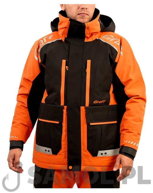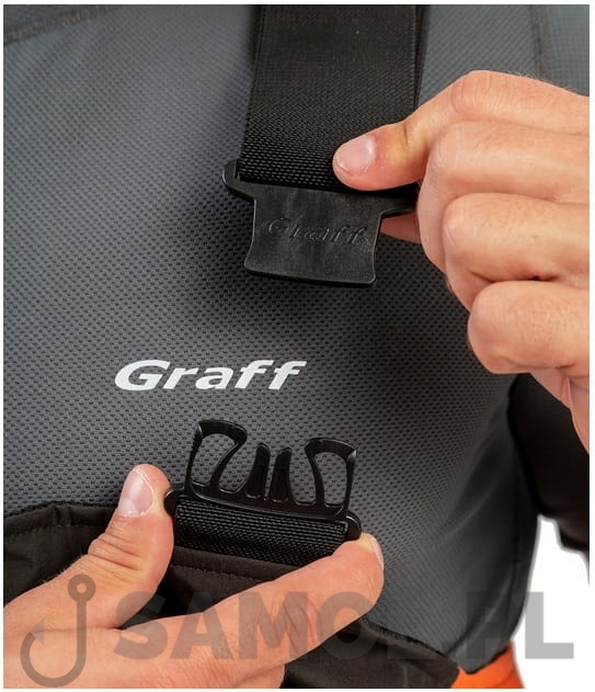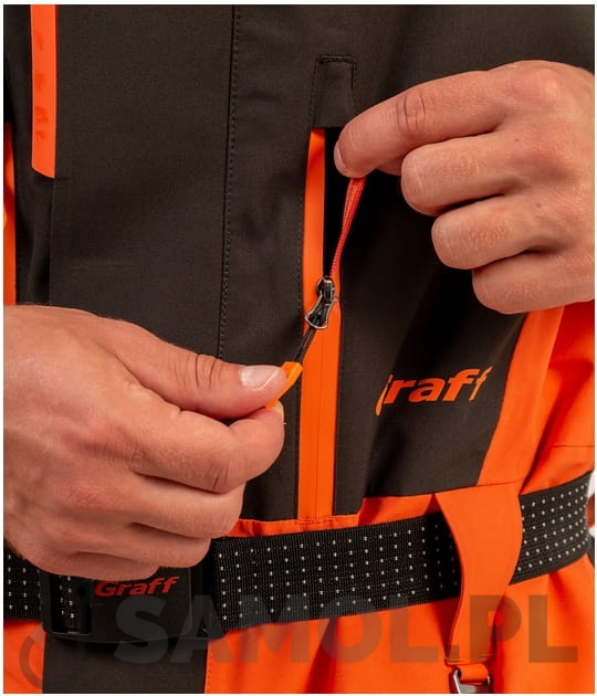 Komplet wypornościowy Graff Float Guard 215-O-B-11 został zaprojektowany z myślą o aktywnych wędkarzach łowiących nawet w ekstremalnych warunkach. Dedykowany jest na sezon jesienno-ziomowy, ze wskazaniem na użytkowanie podczas niskich temperatur. Za sprawą zastosowanej membrany BRATEX® o podwyższonych parametrach paroprzepuszczalności i wodoszczelności (wodoodporność 8000 mm H2O/ oddychalność 8000 g/m2/24 h) zapewnia komfort termiczny dzięki odprowadzaniu nadmiaru wilgoci z wnętrza odzieży, a jednocześnie chroni przed deszczem, śniegiem i wiatrem. Ponadto wierzchnia warstwa odzieży została pokryta apreturą DRY CARE®, co sprawia, że strój jest odporniejszy na zabrudzenia oraz jeszcze lepiej zabezpiecza przed wilgocią. Wiele praktycznych rozwiązań nadaje unikatowy, funkcjonalny charakter.