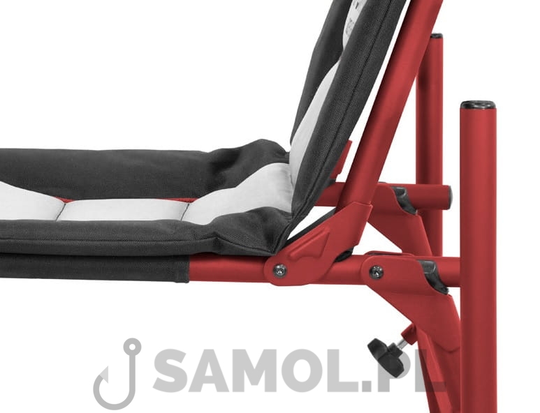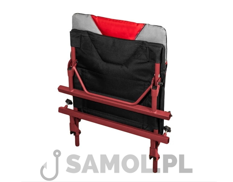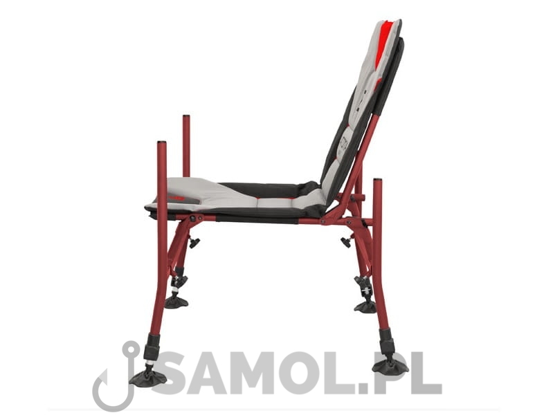 RaceBase to wysokiej jakości krzesło feederowe, które przyciągnie uwagę wymagających miłośników feederowej techniki łowienia. Wyjątkowo mocna żelazna konstrukcja jest podstawą tego krzesła. Posiada bordowe wykończenia, charakterystyczne dla produktów z serii ATOMA. Dzięki swojej konstrukcji i zastosowanemu materiałowi krzesło to nie będzie miało problemu nawet z cięższymi wagowo wędkarzami. Siedzisko i oparcie uszyte są z bardzo wytrzymałej tkaniny i posiadają kilka ciekawych ergonomicznych i designerskich elementów. Miękka wyściółka gwarantuje duży komfort nawet podczas dłuższego łowienia lub podczas zawodów. Poszczególne nogi krzesła wsuwane są na boki z rurek o profilu kwadratowym, dzięki czemu nie dochodzi do przewracania się. Przednia para nóg w stosunku do tylnej ma znacznie wydłużone górne rurki. To rozwiązanie nie jest powszechne, ale jest to absolutnie funkcjonalny detal. Dzięki dłuższej nodze można na tym profilu umieścić więcej elementów, a taka konstrukcja daje krzesłu znacznie większą uniwersalność, dzięki czemu wszystkie najpotrzebniejsze rzeczy zawsze mamy pod ręką. Wszystkie cztery nogi są wysuwane i wyposażone w wysokiej jakości przegubowe stopki wykonane z solidnego tworzywa sztucznego. Dzięki temu krzesło będzie można rozłożyć nawet na nierównym terenie. Dodatkowo stopki zapobiegają zapadaniu się krzesła w podłoże, w przypadku bardziej miękkiej powierzchni. Podczas projektowania tego krzesła szczególną uwagę zwrócono na jego stabilności, dlatego do przedniej pary nóg dodany został mechanizm blokujący, który zapobiega przechylaniu się, a następnie przewracaniu się krzesła przy użyciu dużych i cięższych ramion feederowych. Maksymalnie dopracowany komfort, i wyjątkowa stabilność to najważniejsze cechy tego produktu.