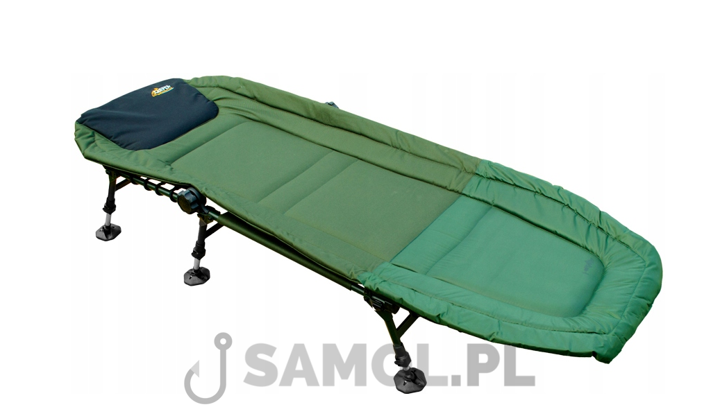 Łóżko kompaktowych rozmiarów. Bardzo wygodne i komfortowe. Wyposażone jest w 6 regulowanych nóg co zapewnia doskonałą stabilność. Duże okrągłe stopki zapobiegają zapadaniu się łóżka na miękkim gruncie. Posiada płaską ramę, komfortowo wyściełaną w wysokiej jakości materiał. W dolnej części materac został obszyty odpornym na wilgoć i zabrudzenia materiałem. Miękka poduszka z neopreny daje dodatkową wygodę i komfort. Regulacja oparcia na pokrętłach pozwala na dobranie odpowiedniego kąta do potrzeb użytkownika.