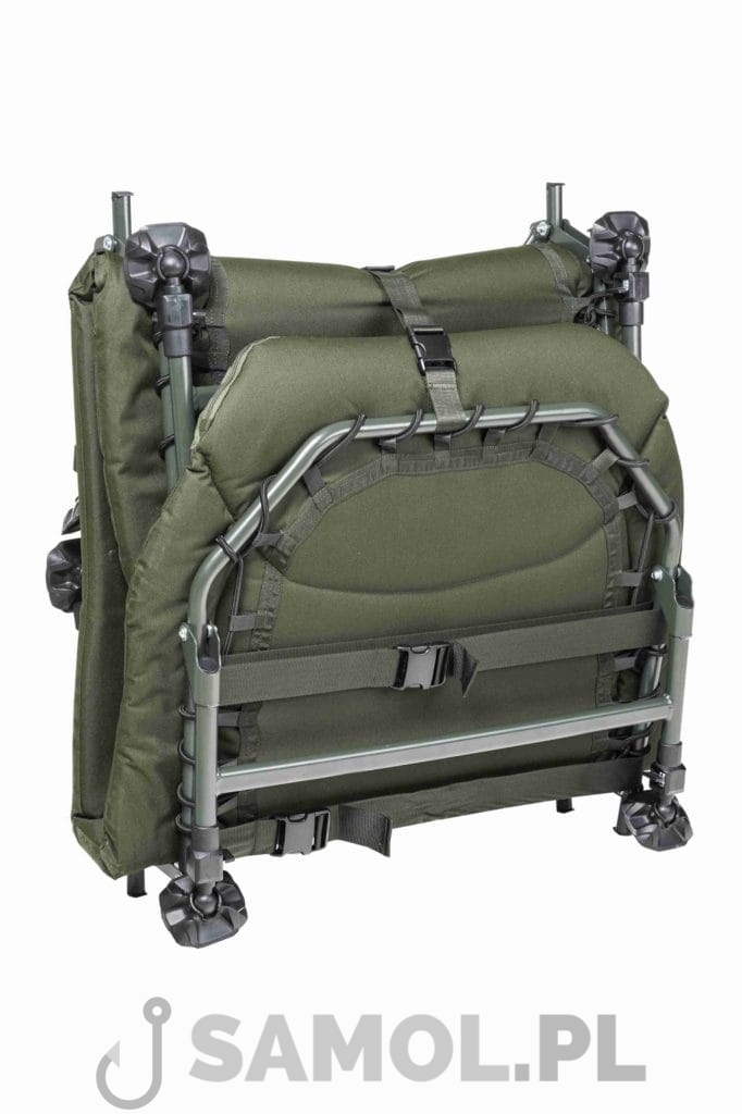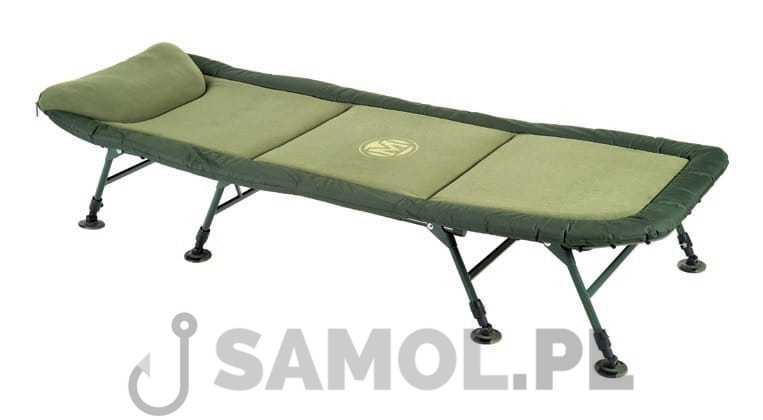 Professional Flat 8 to jak sama nazwa wskazuje wygodne łóżko z grubym piankowym materacem, które posiada 8 regulowanych nóg. Nogi mają szerokie stopy co zapobiega zapadaniu się łóżka w miękkim podłożu. Materac posiada ciepłe polarowe poszycie co zapewnia jeszcze większy komfort. W przedniej części znajduje się duża i niesamowicie wygodna poduszka, którą możemy wyciągnąć poprzez odpięcie zamka błyskawicznego, wszytego w górnej części materaca. W łóżku zastosowano system napinania, który pozwala na regulację twardości materaca. Po złożeniu łóżko możemy spiąć klamrą co ułatwi jego transport.