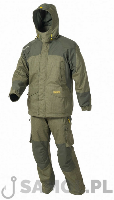 Mivardi Hardcore 3in1 to doskonały strój na jesienno-zimowe i wczesnowiosenne wyjazdy na ryby. Doskonała ochrona przed zimnem, mrozem i przeszywającym wiatrem. Jest to ubranie trzy częściowe: spodnie, kurtka i odpinana podpinka, którą można nosić osobno jak polar. Jak sama nazwa wskazuje jest to strój na naprawdę hardcorową pogodę. Materiał, z którego został wykonany jest 100% wodo i wiatrochronny oraz posiada dużą przepuszczalność powietrza co pozwala odprowadzić ciepło, które wydzielamy dzięki czemu nie pocimy się w nim. Spodnie z czterema kieszeniami zapinanymi na zamki, które są wodoszczelne. Posiadają szelki z ochroną pleców i nerek, z tyłu. W dolnej części spodni przy kostce ściągacze z regulacją na rzep i zatrzaski co pozwala dopasować szerokość nogawki do buta. Kurtka z pięcioma kieszeniami plus dwie kieszenie wewnątrz w podpince. Przy rękawach ściągacze na rzepy zabezpieczające przed dostawaniem się wiatru do rękawów. Kurtka posiada kaptur, który jest usztywniany w części daszka oraz posiada regulację. W razie potrzeby kaptur można odpiąć. Doskonale zaprojektowany krój tego zestawu pozwala wygodnie siedzieć, chodzić, nie wspominając o zarzucaniu, nęceniu czy holowaniu ryb.