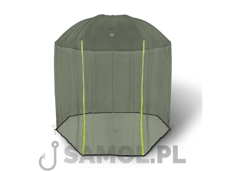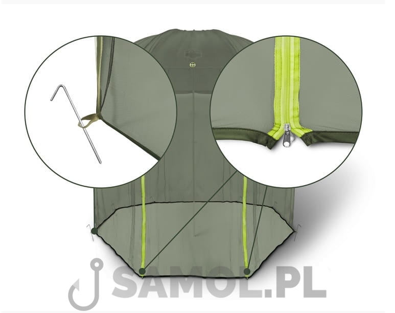 Bardzo skuteczna ochrona przed komarami i insektami. Moskitiera Delphin AntiFLY ma standardowy rozmiar, który pasuje do niemal wszystkich dostępnych na rynku parasoli wędkarskich. Cały system opiera się na centralnym otworze, który znajduje się na środku górnej części parasola i 8 kołkach, które są w zestawie z moskitierą. Wejście posiada dwa dobrze widoczne zamki błyskawiczne dla lepszej orientacji w nocy lub podczas słabej widoczności. Cienka siatka zapewni najlepszą ochronę przed wstrętnymi owadami.