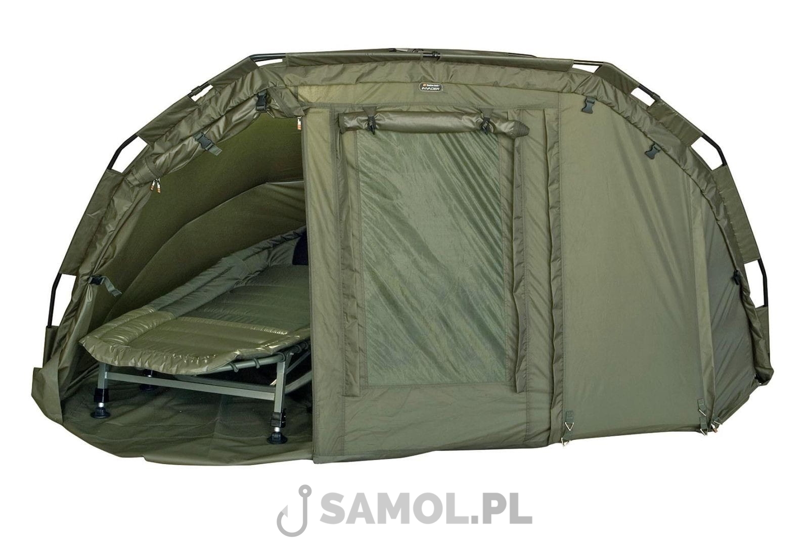 Invader EX to zwarty, kompaktowy namiot i kwadratowym kształcie, co zwiększa przestrzeń wewnątrz. Stelaż składa się z trzech, mocnych, aluminiowych rurek, biegnących równolegle przez całą szerokość namiotu. Super stabilne bivvy, które pomieści jednego wędkarza i cały sprzęt na długich zasiadkach.
