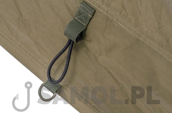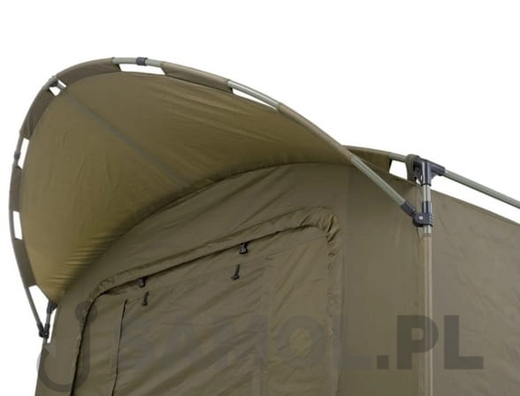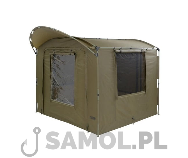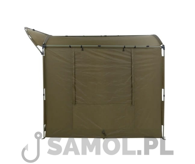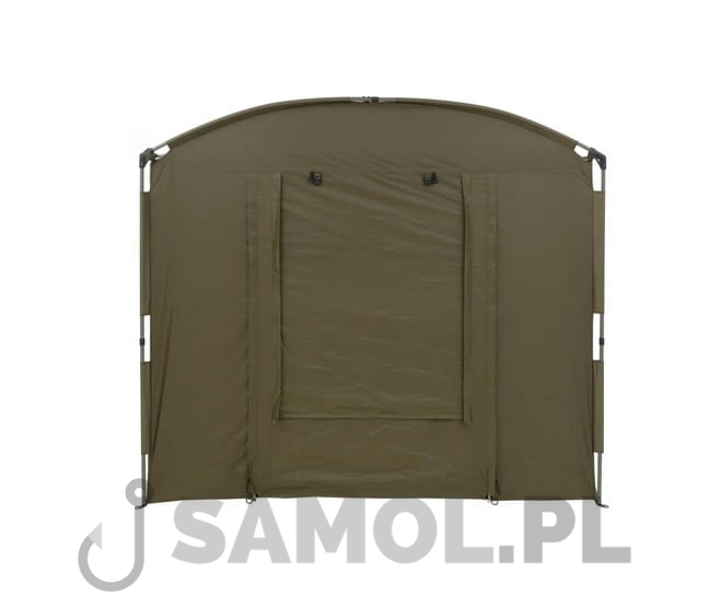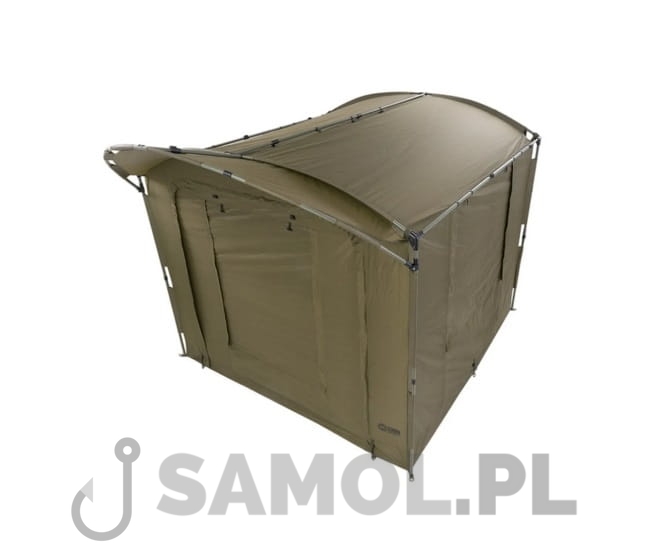 Dzięki szerokiemu daszkowi, wejście do Shelter Base Station zabezpieczone jest przed zacinającym deszczem. Do namiotu można opcjonalnie dokupić pełną narzutę lub specjalne organizery wpinane wewnątrz.
