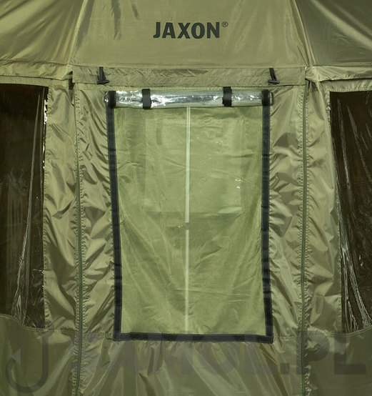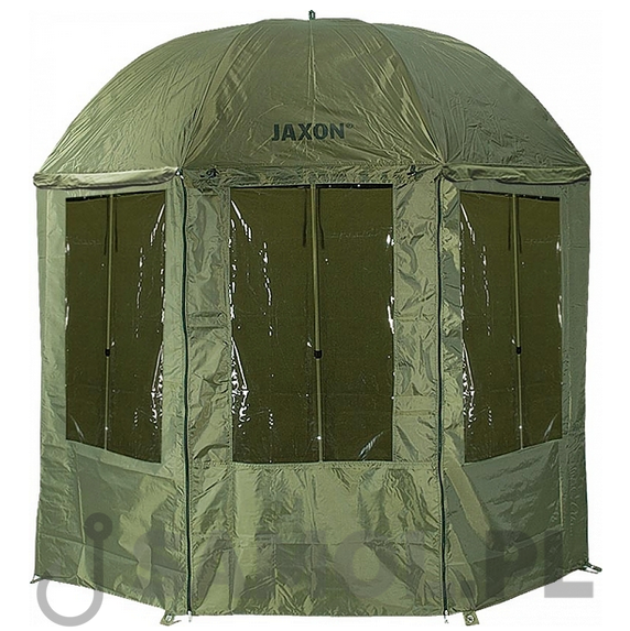 Duży parasol z osłoną chroniącą przed deszczem i wiatrem. Posiada gruby, wodoodporny materiał oraz mocne podklejane szwy. Wyposażony został w dodatkowe okienko w tylnej części osłony z moskitierą, co w cieplejsze dni pozwala zachować przewiew bez obaw przed insektami. Stelaż czaszy parasola ma długość 250 cm, co biorąc pod uwagę kształt czaszy, daje średnicę około 200-210 cm.