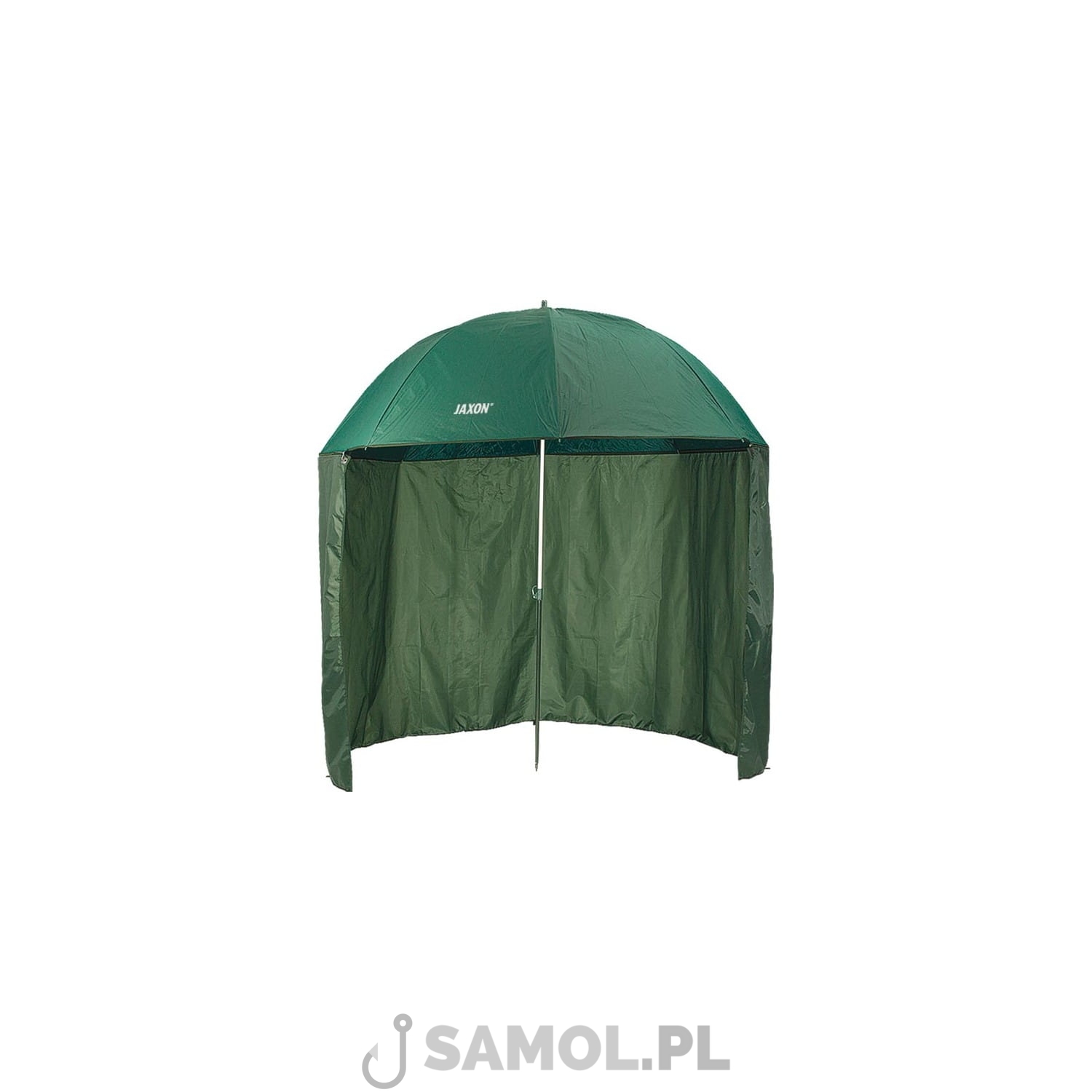 Duży parasol z osłoną chroniącą przed deszczem i wiatrem. Stelaż czaszy parasola ma długość 250 cm, co biorąc pod uwagę kształt czaszy, daje średnicę około 200-210 cm.