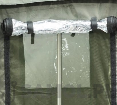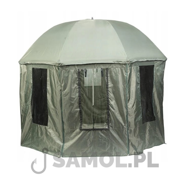 Duży parasol z osłoną tworzą zamkniętą przestrzeń z dodatkowym okienkiem w tylnej części osłony oraz z dwoma moskitierami - z przodu i z tyłu. Pełna osłona przed deszczem i wiatrem. Stelaż parasola o długości 300 cm, co daje w efekcie średnicę około 250-260 cm.