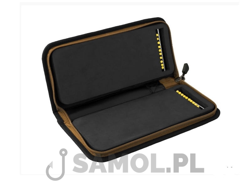 Usztywniony piórnik Rig na przypony, zamykany na mocny zamek błyskawiczny. Piórnik jest prosty w konstrukcji, ale jego wykonanie świadczy o jakości i trwałości. Na zewnątrz jest wzmocniony, pokryty impregnowanym materiałem. Wewnątrz znajduje się warstwa PVC, dzięki czemu przypony zawsze będą suche. Przypony instaluje się na tabliczkach z twardej pianki za pomocą pinesek, które mają okrągłe główki. Do mocowania użyto także metalowej poprzeczki. Kombinacja materiału wewnętrznego i wewnętrznego dokładnie zabezpieczy całą zawartość piórnika. Piórnik jest wyposażony w zamek błyskawiczny z metalową prowadnicą, która zapewnia jej długą żywotność.