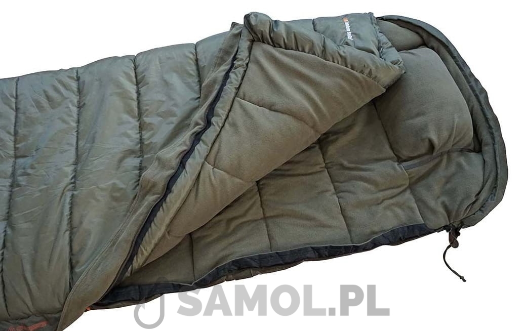 Duży, ciepły i komfortowy śpiwór wędkarski, który idealnie spisuje się od wczesnej wiosny do późnej jesieni. To najlepszy śpiwór na rynku, biorąc pod uwagę stosunek jakości do ceny. Ten śpiwór to prawdziwa legenda, ciesząca się bardzo dużą popularnością. Tkanina zewnętrzna: 210D poliester ribstop – z laminatem DWR i wodoodporną warstwą poliuretanową. Tkanina wewnętrzna; niemechacący się micro flece, gramatura 180 g/m2. Wypełnienie dwuwarstwowe: polyester hollow fibre -250 g/m2. Supermocny worek kompresyjny (38cm x 50 cm). W górnej części posiada wewnętrzną kurtynę utrzymującą ciepło. Antypoślizgowy system: dwa kołnierze mocujące, taśma zapinana na klamrę oraz dodatkowy pas. Wyposażony został w mocny zamek błyskawiczny oraz taśmy zabezpieczające przed jego przytrzaśnięciem.