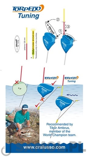 Spławik Cralusso Torpedo Tuning został stworzony do łowienia w wodach płynących. Charakterystyczne wyżłobienie czyni go niezwykle stabilnym, nie tylko w równym uciągu, lecz również w wirach. Specjalnie zaprojektowany korpus nie wystaje ponad powierzchnię wody podczas pełnego trzymania, a przy zastosowaniu płetwy tuningowej korpus płynie kilka centymetrów pod wodą, natomiast ponad lustro wody wystaje wyłącznie antenka. Pozwala to wychwycić nawet najczulsze brania.