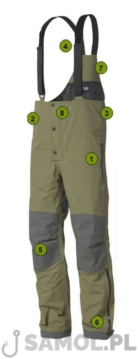 - Podwyższony pas i tylna część spodni doskonale chronią przed wiatrem i deszczem.