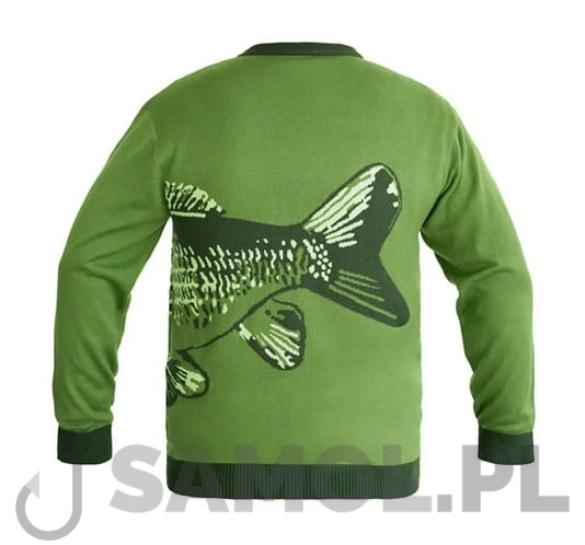 Sweter Delphin CARP Knitted Sweater jest wykonany z ciepłego materiału, który zapewnia niezbędną ochronę przed zimnem i wysoki poziom komfortu podczas noszenia. Jest w ciemnozielonym kolorze, a jego charakterystyczną cechą jest duża grafika karpia zarówno z przodu, jak i z tyłu swetra.