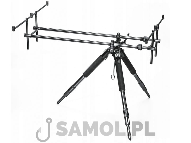 Wykonany z oxydowanego aluminium. Posiada Duży zakres ustawień i regulacji. Po rozłożeniu można zablokować go w dowolnym położeniu. Tripod jest bardzo stabilny i świetnie nadaje się na łowiskach gdzie ciężko wbić podpórki lub gdy łowimy z pomostów. Przystosowany na 3 wędki. W komplecie posiada pokrowiec transportowy.