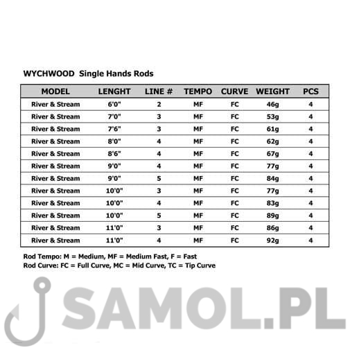 Wychwood zawsze stał na czele innowacji i designu w projektowaniu wędek muchowych w swoim przedziale cenowym. Podobnie jest z nową serią River & Stream. Wędki te doskonale kontynuują tą tradycję. Są to wspaniałe wędki, które wyglądają świetnie a w dodatku oferowane są w fantastycznej cenie. Jakość wykonania i dbałość o szczegóły sprawiają, że są w rzeczywistości bardzo konkurencyjne nawet z wędkami o wiele droższymi. Nowe wędki River & Stream produkowane są wyłącznie z najlepszej klasy włókna węglowego dostępnego na rynku, zapewniając niezrównanie lekkie blanki w niezwykle smukłych formach o aksamitnym ugięciu. Kilka wędek w tym zakresie jest jednymi z najlżejszych wędek dostępnych na rynku światowym! Cała gama oferowanych wędek to 12 modeli począwszy od wędek 11’ i 10‘ – cio stopwych z przeznaczeniem głównie do nimfy poprzez 7 modeli z przeznaczeniem do suchej i mokrej muchy, wszystkie w przedziale AFTM od #2 do #5. Wędki o akcji medium fast, zbudowane są z najwyższej jakości włókna węglowego z uchwytem kołowrotka z anodowanego aluminium, rękojeści z korka klasy Premium AAAA oraz insertu z egzotycznego drewna. Do tego dodajmy wysokiej jakości przelotki gang smoke oraz super cienki a zarazem super lekki blank w kolorze zieleni z metalicznym wykończeniem. Doskonała praca blanku pozwala na idealną prezentację muchy a długie łowienie staje się wielką przyjemnością natomiast dbałość o szczegóły oraz jakość wykończenia sprawiają, że jest to bardzo ciekawa propozycja dostępna za niewygórowaną cenę. Wędki oferowane są w 4-ro składzie wraz z tubą ochronną wykonaną z kompozytu Carbon/Glass fibre.