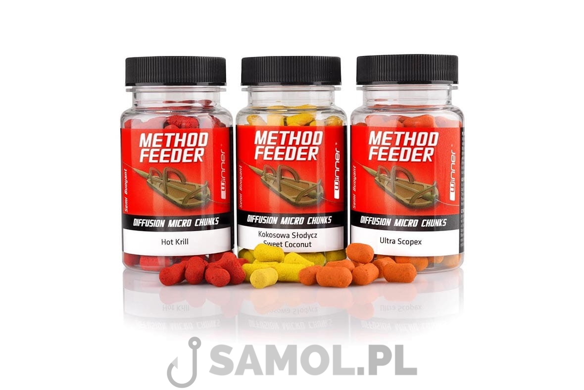 Method Feeder Diffusion Micro Chunks to specjalnie skomponowane neutralnie wybalansowane przynęty haczykowe o dużej zawartości aromatów, ekstraktów i dodatków smakowych. Zawierają również dobrze widoczny w wodzie barwnik, który uwalniając się z przynęty, tworzy fluorescencyjną chmurę, skutecznie wabiącą ryby przepływające w okolicy zestawu. Diffusion Micro Chnks to idealne przynęty do tzw. method feeder na wody o dużej presji wędkarskiej. Specjalny kształt wałka pozwala na ekspresowy montaż przy pomocy gumki.