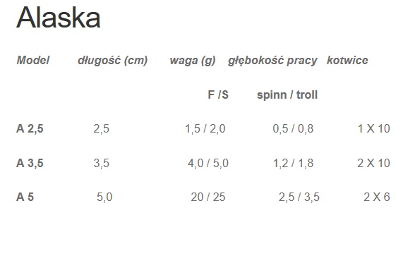 Wobler Alaska to jeden z pierwszych w asortymencie firmy Dorado. Pracuje mocno wibrując i daje się prowadzić zarówno pod prąd jak i z prądem. Najmniejsze z oferty 2,5cm woblery idealnie sprawdzają się podczas połowu lipieni i jazi. Wersja Sinking to gamma woblerów tonących. Jego głębokość prac w spinningu to 0,5m a w trollingu do 0,8m. Wersja tonąca, waga: 2g.