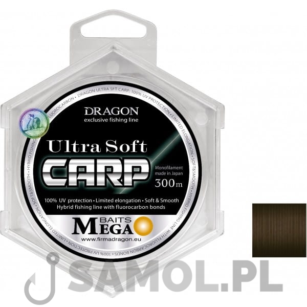 Nowoczesna linka o budowie hybrydowej, przystosowana do połowu karpi i innych dużych ryb spokojnego żeru. Wyprodukowana w Japonii, przez koncern Momoi, na zamówienie firmy Dragon. Dzięki zastosowaniu specjalnej otuliny z fluorocarbonu wokół klasycznego, nylonowego rdzenia, udało się uzyskać produkt łączący w sobie wszystkie zalety nylonu i fluorocarbonu. Uzyskaliśmy żyłkę, która z jednej strony ma wytrzymałość identyczną z klasycznym włóknem nylonowym a jednocześnie szybko tonie, jest zdecydowanie mniej rozciągliwa, bardzo odporna na ścieranie i inne uszkodzenia mechaniczne. Jeżeli dodać do tego takie cechy jak maskujący na dnie, ciemnobrązowy kolor, bardzo wysoką wytrzymałość dynamiczną, miękkość i całkowity brak pamięci kształtu to śmiało możemy przyjąć, że nowa żyłka MegaBaits Ultra Soft Carp jest idealną linką dla najbardziej wymagających wędkarzy. Konfekcjonowana w odcinkach po 300 metrów, zapakowana została w szczelne plastikowe pudełko, dzięki czemu jest znacznie bardziej odporna na zróżnicowane warunki przechowywania.