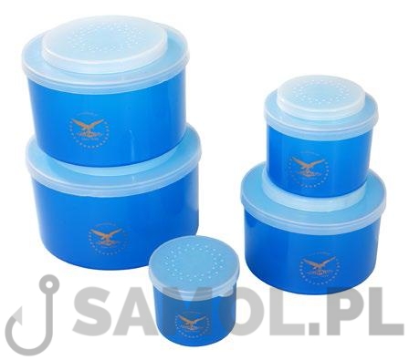 Komplet zawodniczych pięciu pudełek przeznaczonych do przetrzymywania żywych przynęt.